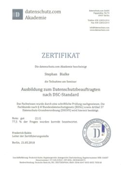 Und da ich von meinen Kunden immer wieder auf die DSGVO angesprochen wurde, insbesondere was die korrekte Umsetzung der technischen und organisatorischen Maßnahmen (TOM) im EDV und IT Bereich betrifft, entschied ich mich für eine Fortbildung zum zertifizierten Datenschutzbeauftragten, um dieser Aufgabe gerecht zu werden. |